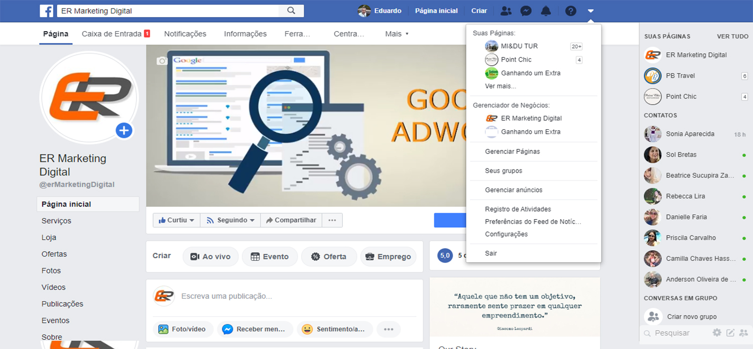 Suas páginas: clicar no ícone de bandeira permite acessar rapidamente qualquer uma das suas páginas do Facebook.