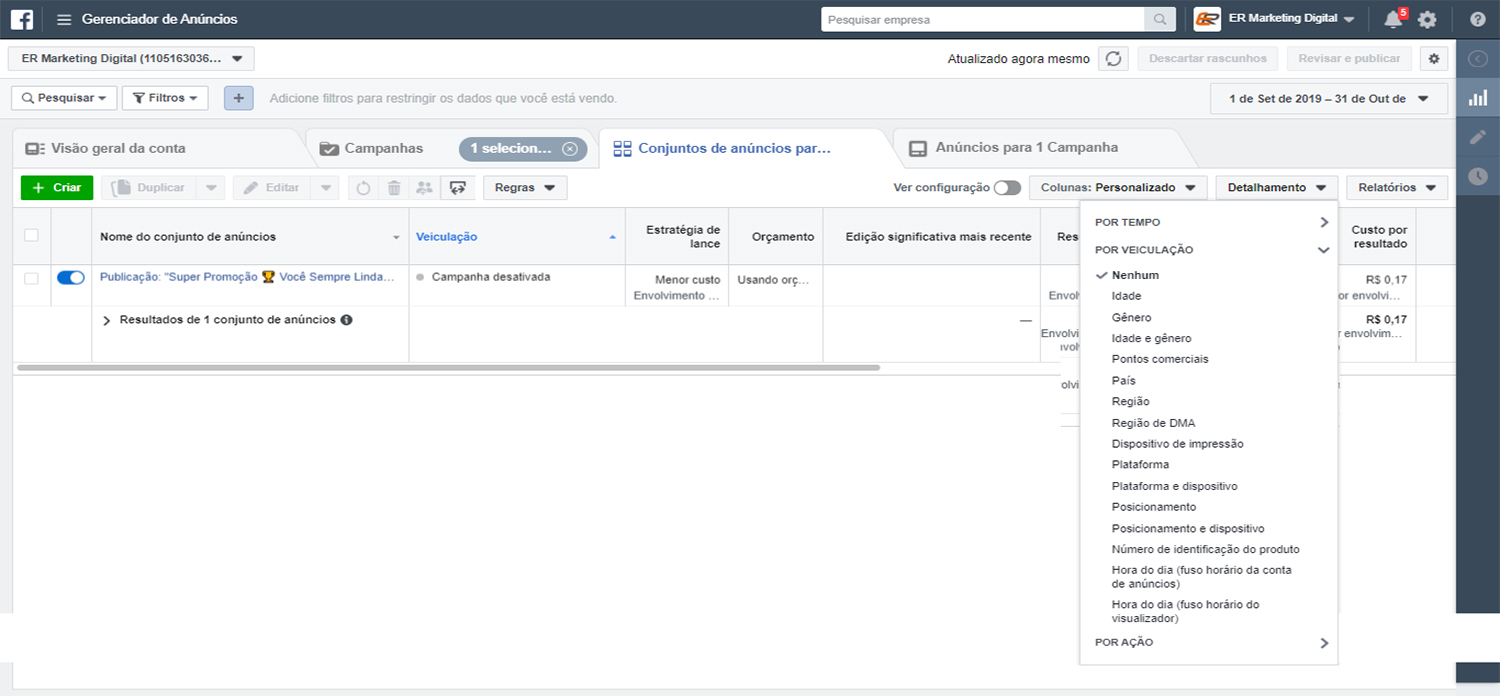 O Facebook Ads Manager permite detalhar cada uma de suas campanhas, conjuntos de anúncios ou anúncios, fornecendo informações mais detalhadas, como resultados ao longo do tempo e detalhamento demográfico.
