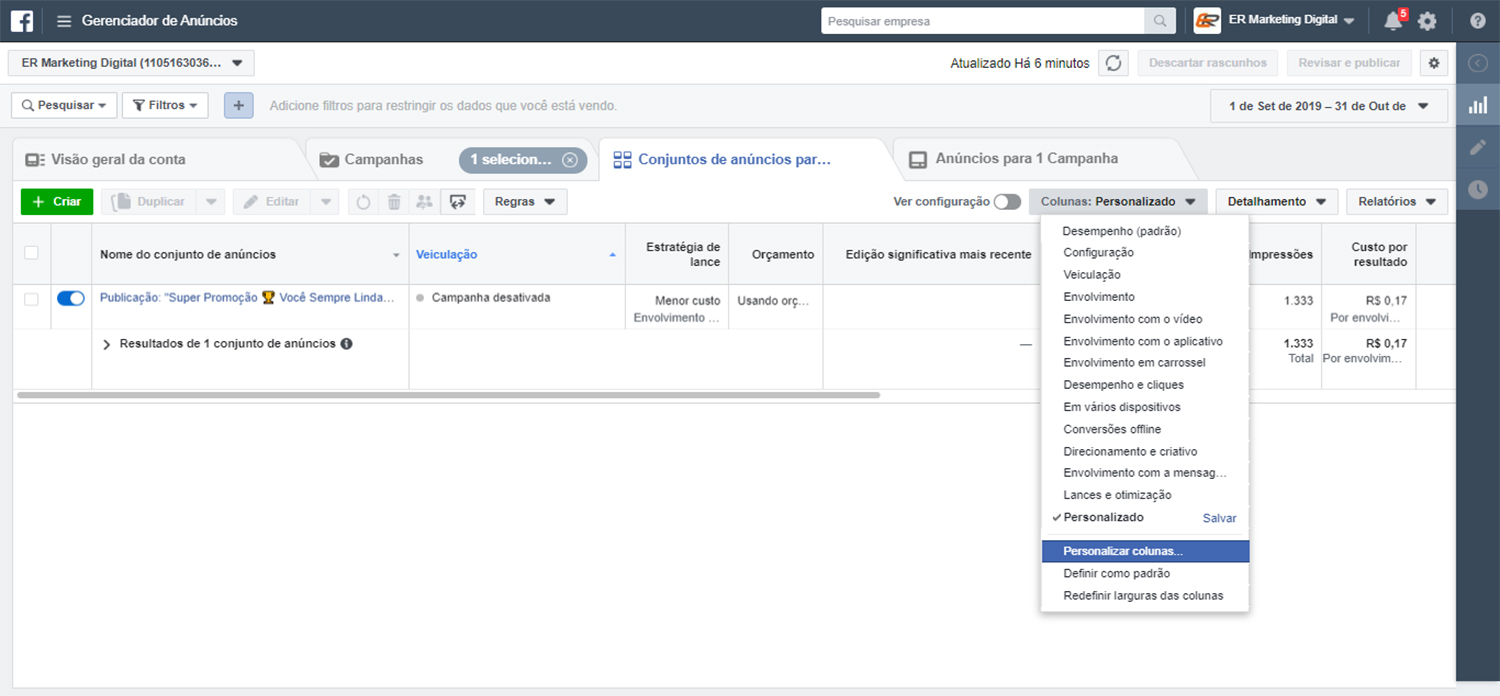Se você estiver visualizando uma campanha, ele mostrará apenas os conjuntos de anúncios ou anúncios da campanha.
