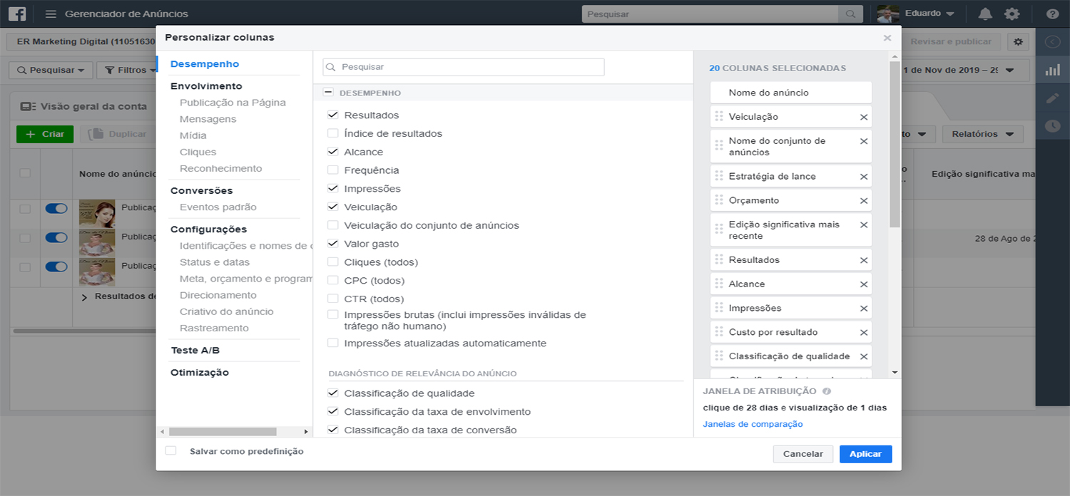 • Desempenho e cliques: resultados, alcance, custo etc.