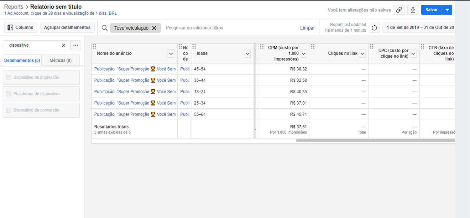 Você também pode selecionar até um critério de cada seção (por exemplo, um de Entrega, um de Ação e um de Tempo), ex: você pode ver os resultados de seus anúncios discriminados por categorias de idade, dispositivos e semanas.