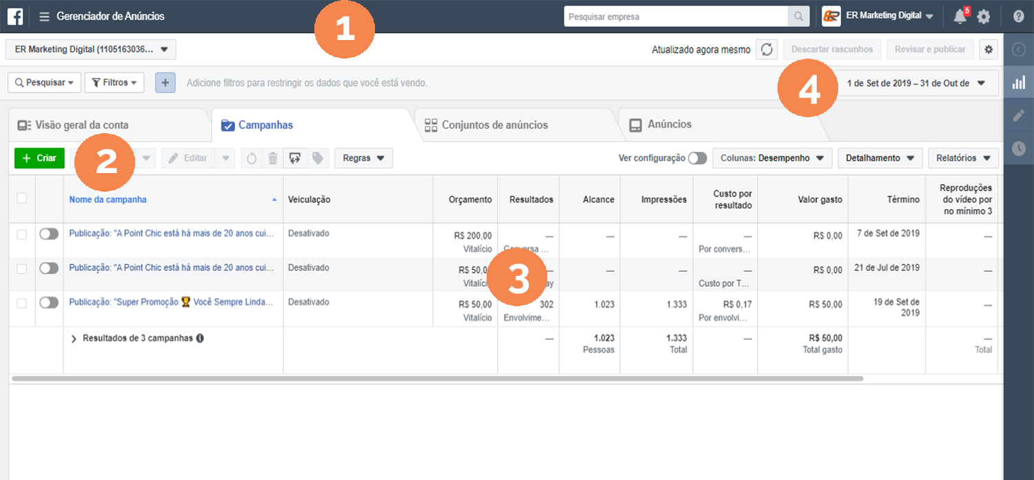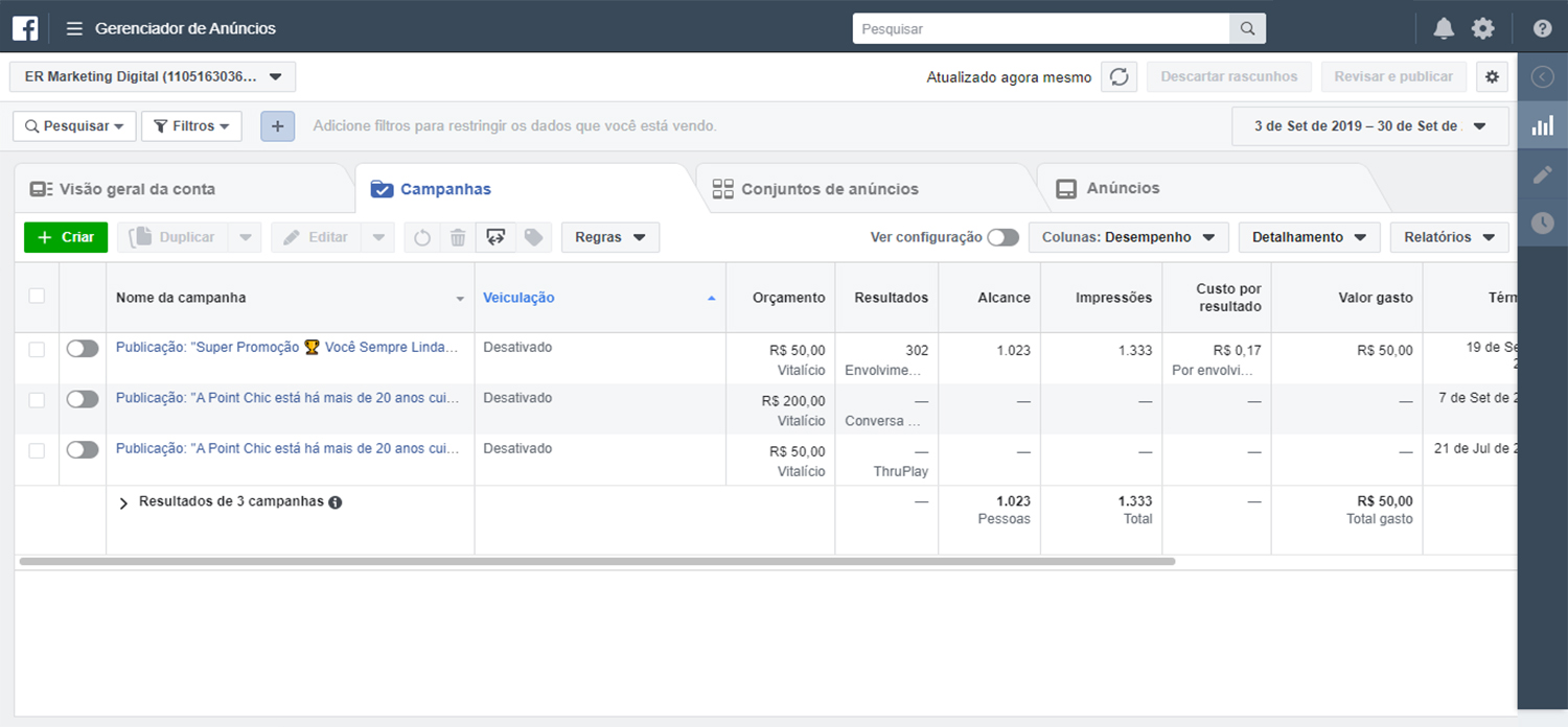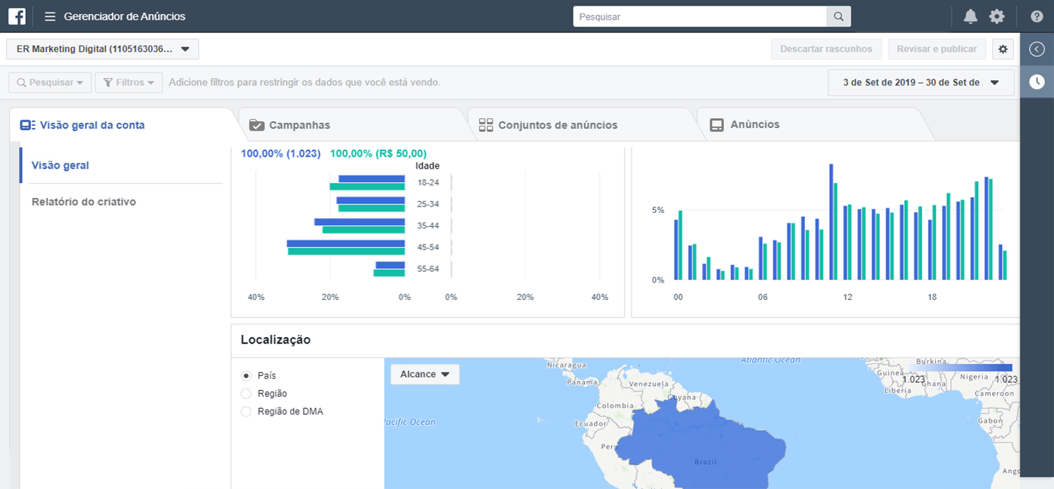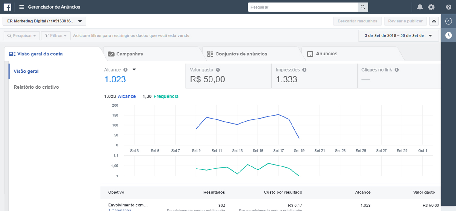 Você pode ainda visualizar dados como resultados de anúncios, impressões, alcance e quantia gasta nas plataformas.