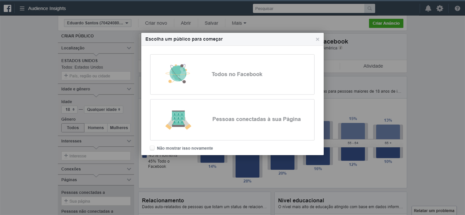 O Audience Insights mostrará os dados demográficos, as páginas que eles gostaram, a localização e muito mais.