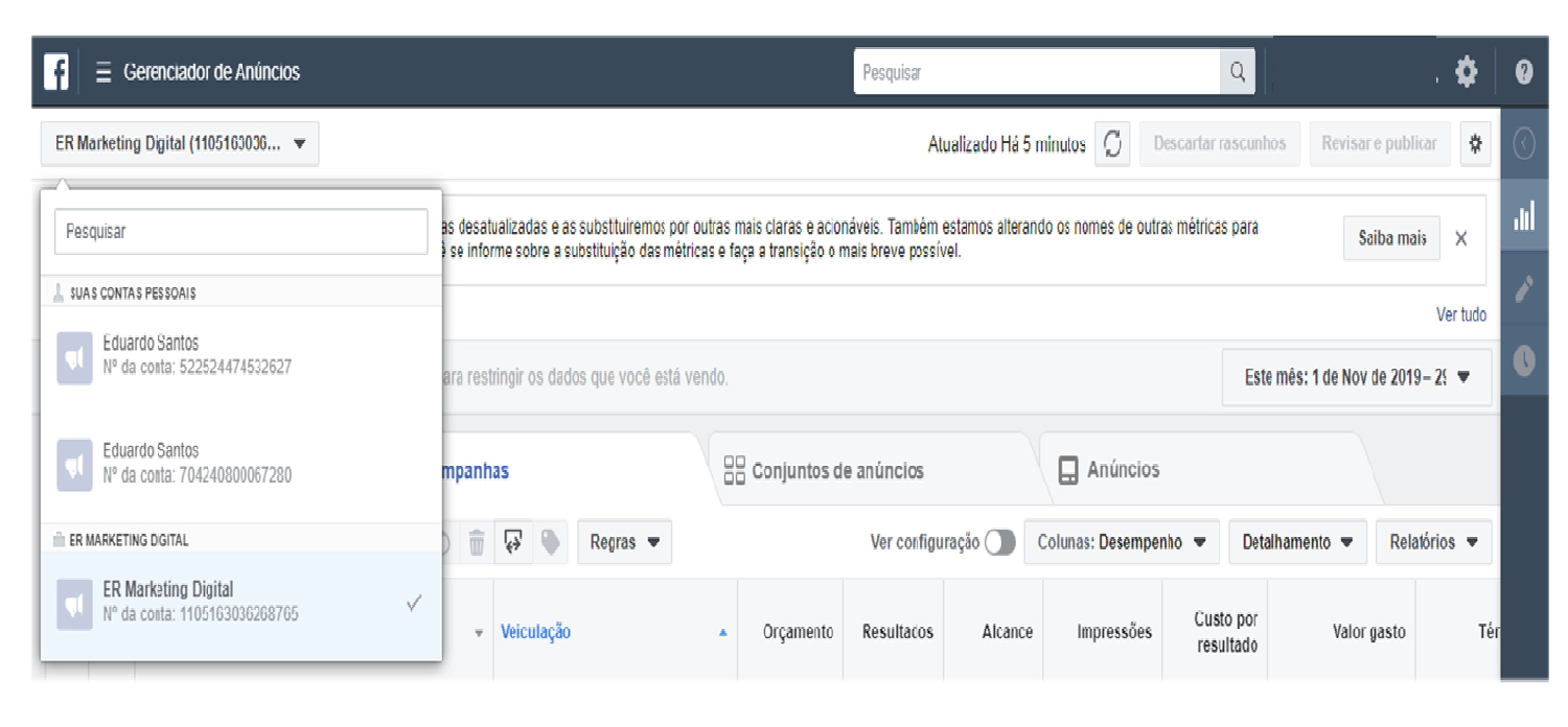 Se você tiver acesso a mais de uma conta de anúncio, é aqui que você também pode selecionar qual conta gerenciar.