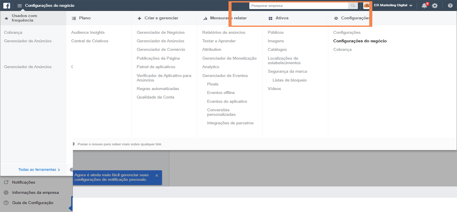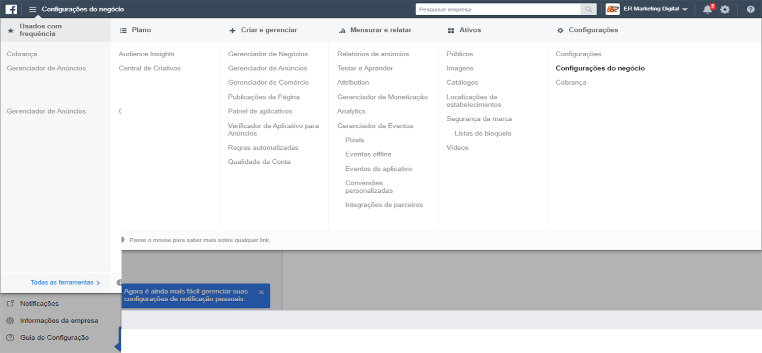 Aqui estão alguns recursos fora do Facebook Ads Manager, que podem ser úteis para você. Eles são acessíveis através do botão de menu no canto superior esquerdo do seu Facebook Ads Manager.