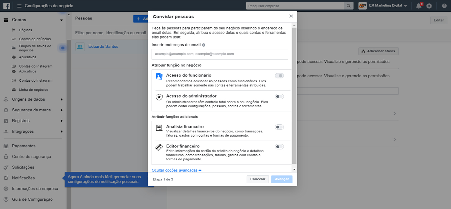 Dica: As funções da página do Facebook, do Facebook Business Manager e da conta de anúncio não são as mesmas. Mesmo se você for o administrador da página do Facebook ou do gerente de negócios da sua empresa, talvez não tenha acesso à conta de anúncio da sua empresa.